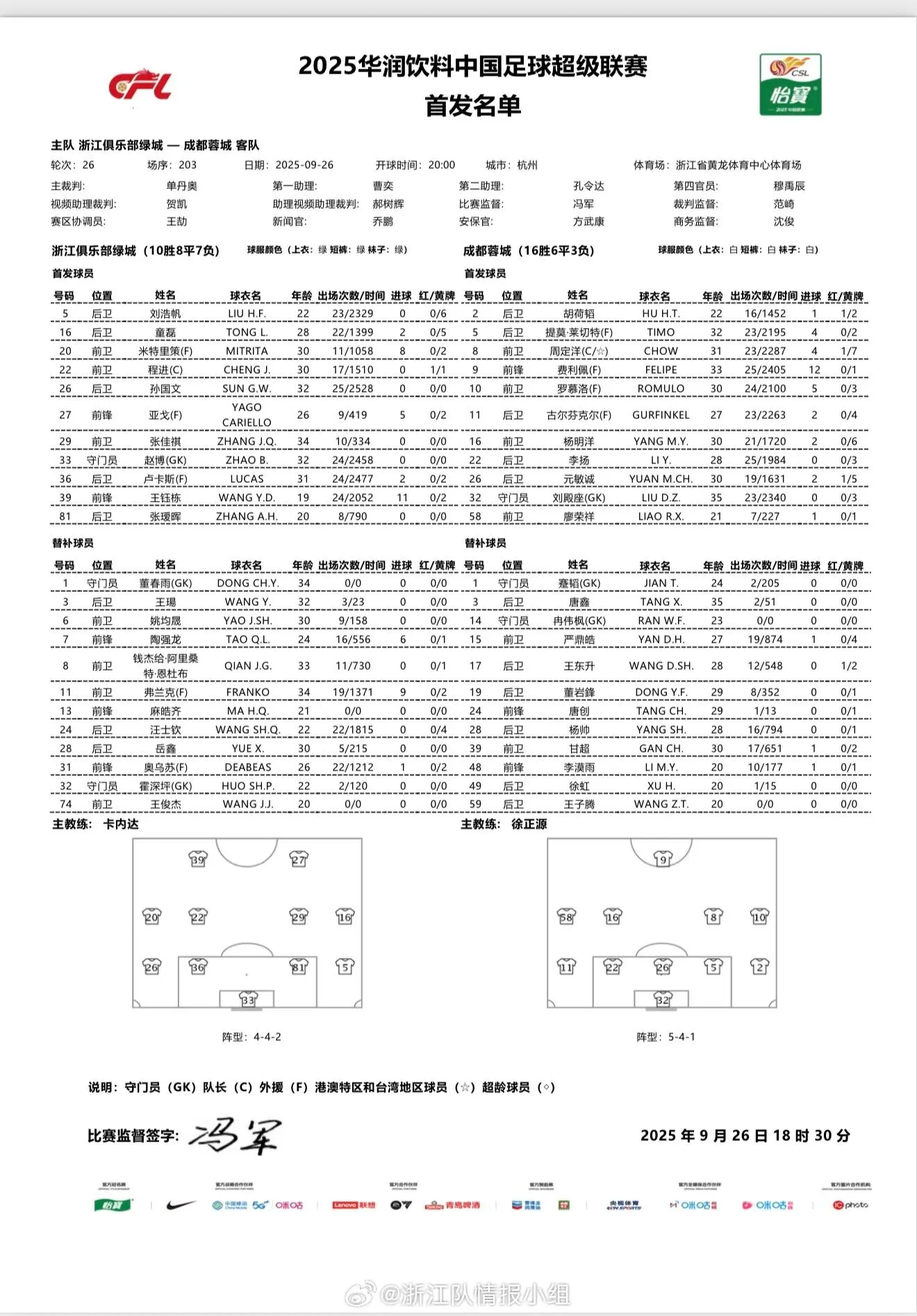 虎扑09月26日讯 今天20:00,浙江即将在主场迎战成都蓉城,赛前双方公布首发名单。