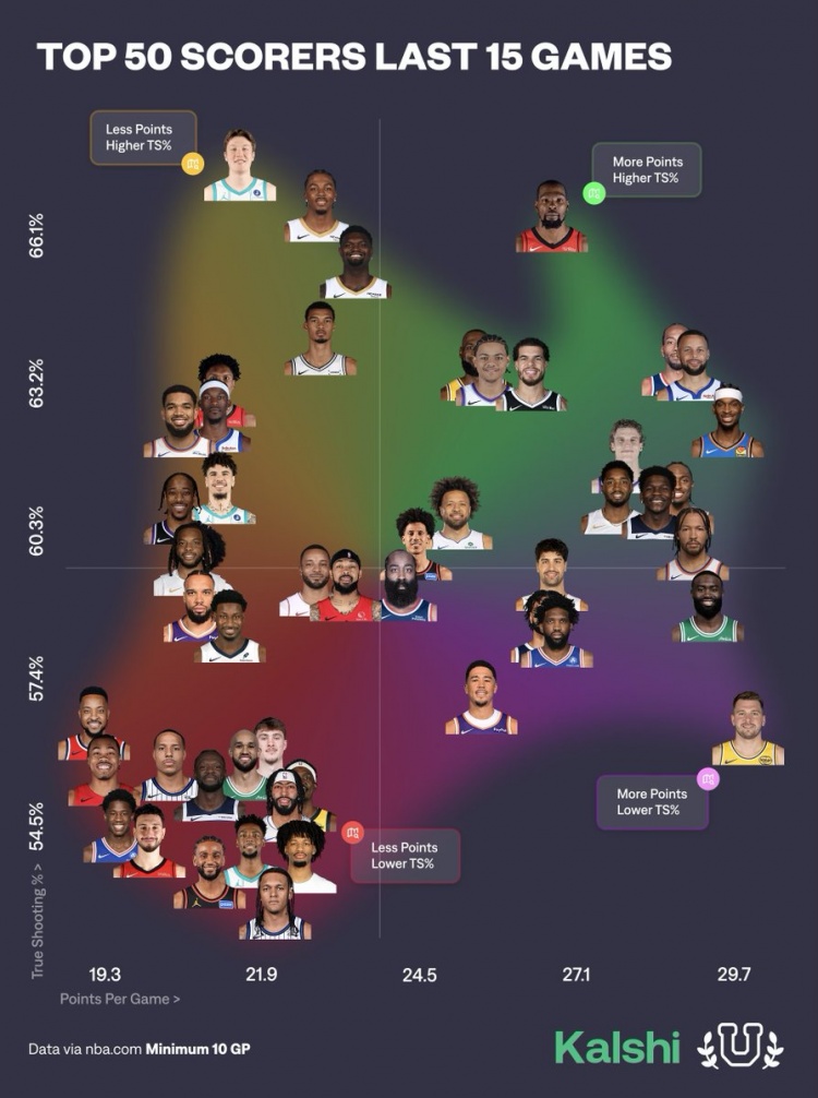 近15场球员得分产效:KD&库里&小卡高产高效 东契奇高产低效